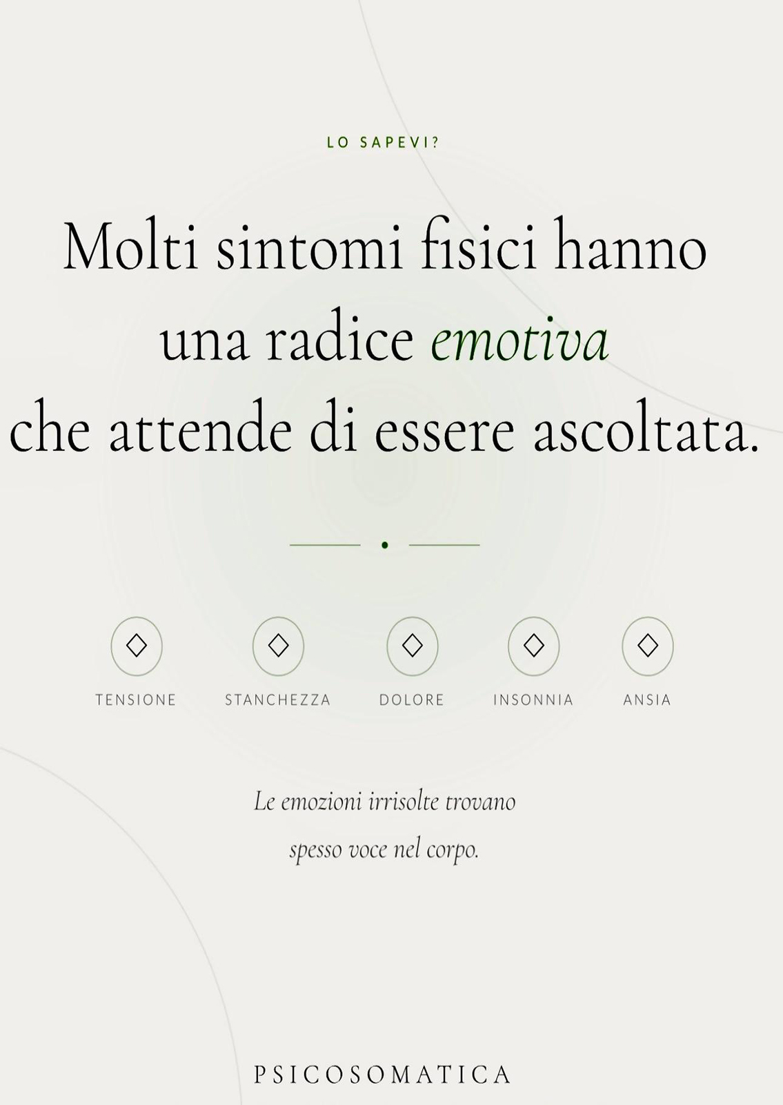 “Corpo e mente parlano continuamente tra loro, anche quando non ce ne accorgiamo. A volte lo stress, le paure o ferite del passato trovano spazio nel corpo, trasformandosi in dolori, tensioni, ipertensione, cardiopalmo o altri segnali che possono rendere le giornate più faticose. Non sono ‘solo sintomi’: sono messaggi che meritano ascolto. Insieme possiamo dare voce a ciò che il tuo corpo sta cercando di raccontarti, costruendo una mappa chiara tra emozioni e sensazioni fisiche, per ritrovare passo dopo passo equilibrio, armonia e benessere.”